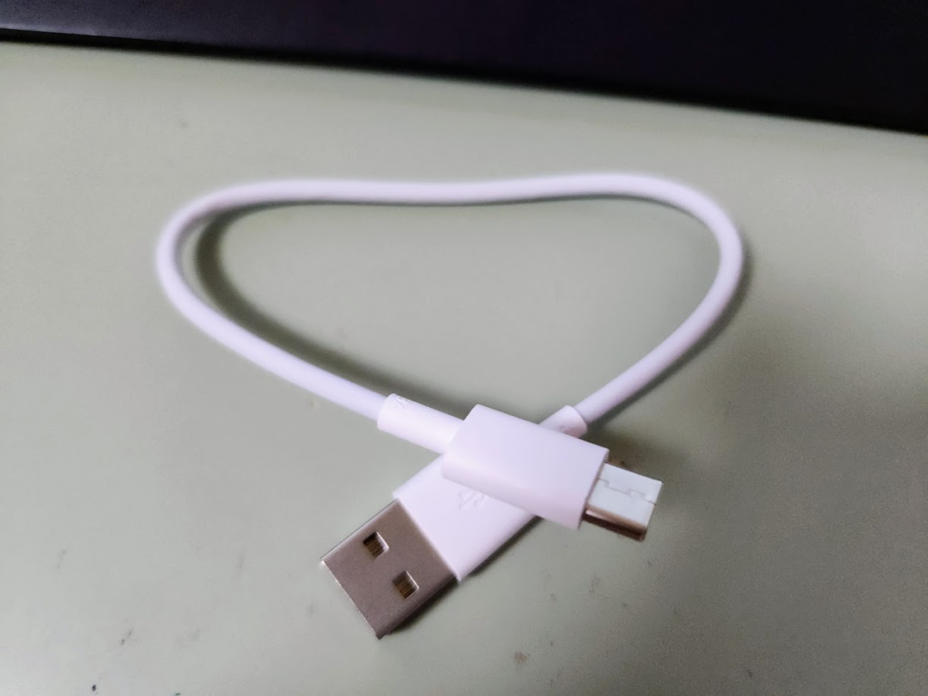充電ケーブルはUSB type A to C で、長さは実測約20cmくらいでした。